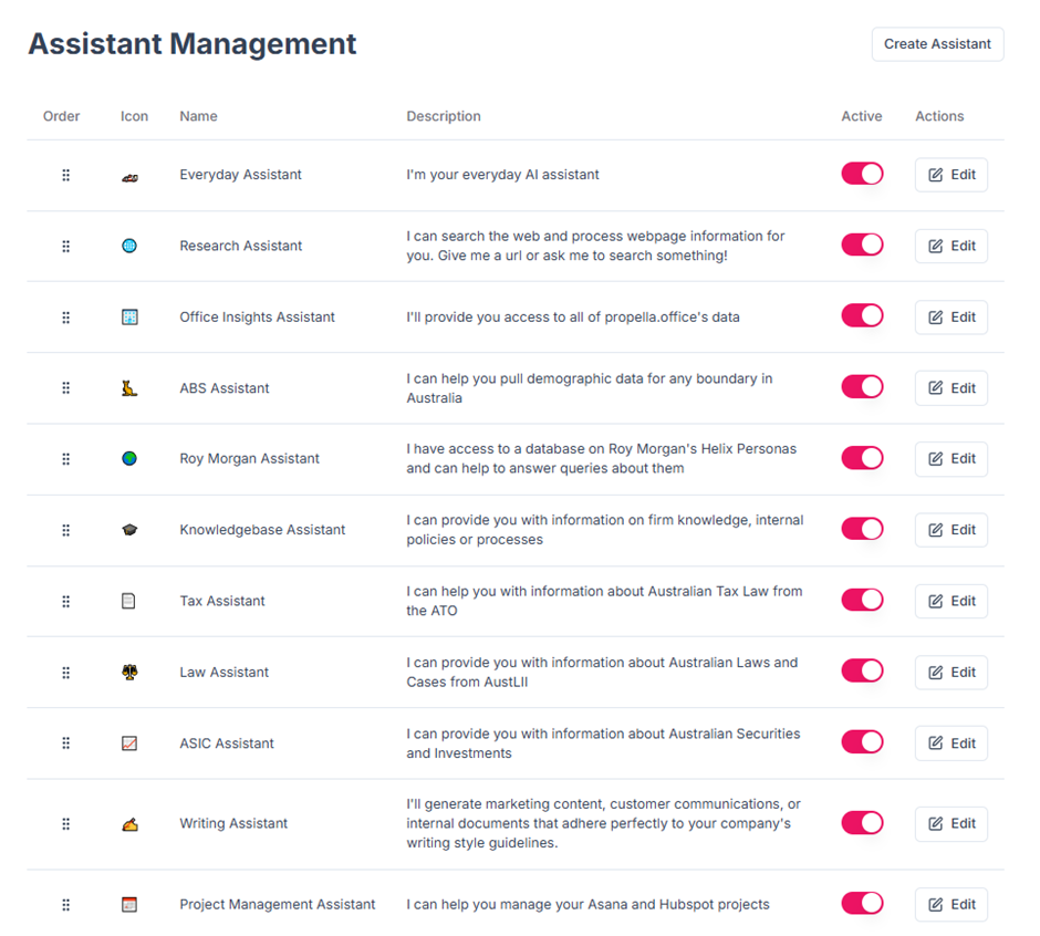 The Assistant Management tab allows you to efficiently manage and customise the various assistants available on the AI Dojo platform. Here, you can:
