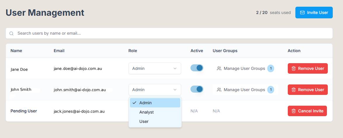The User Management tab is where you handle all aspects of user roles and permissions, ensuring proper access control within the platform. Key functions include:
