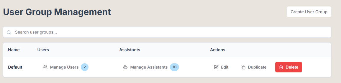 User Group Management allows you to effectively categorise users and control their access to various assistants and functionalities. In this tab, you can: