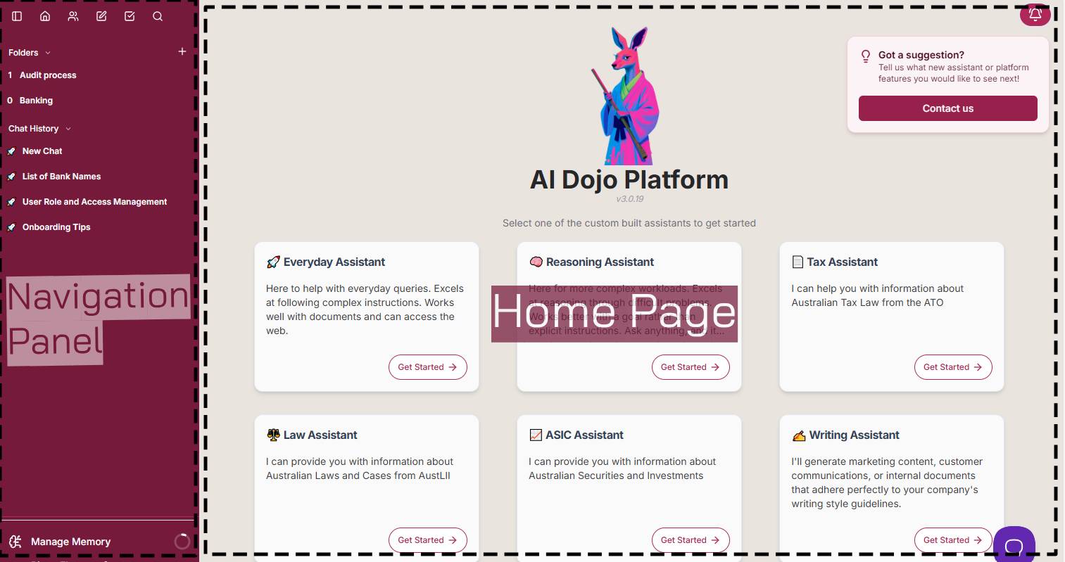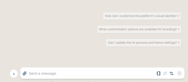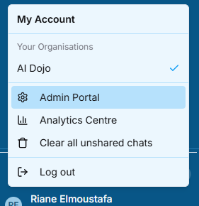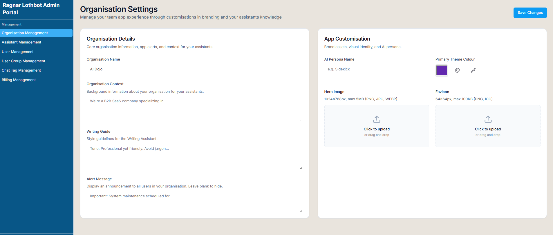- App Customisation: Configure your AI Dojo persona, platform name, sidebar colour and hero image to establish a consistent visual identity.