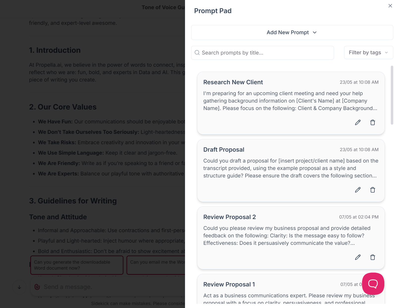 Use the Prompt Pad to save helpful prompts you use often. Add tags and open the Pad to reuse prompts at any time.