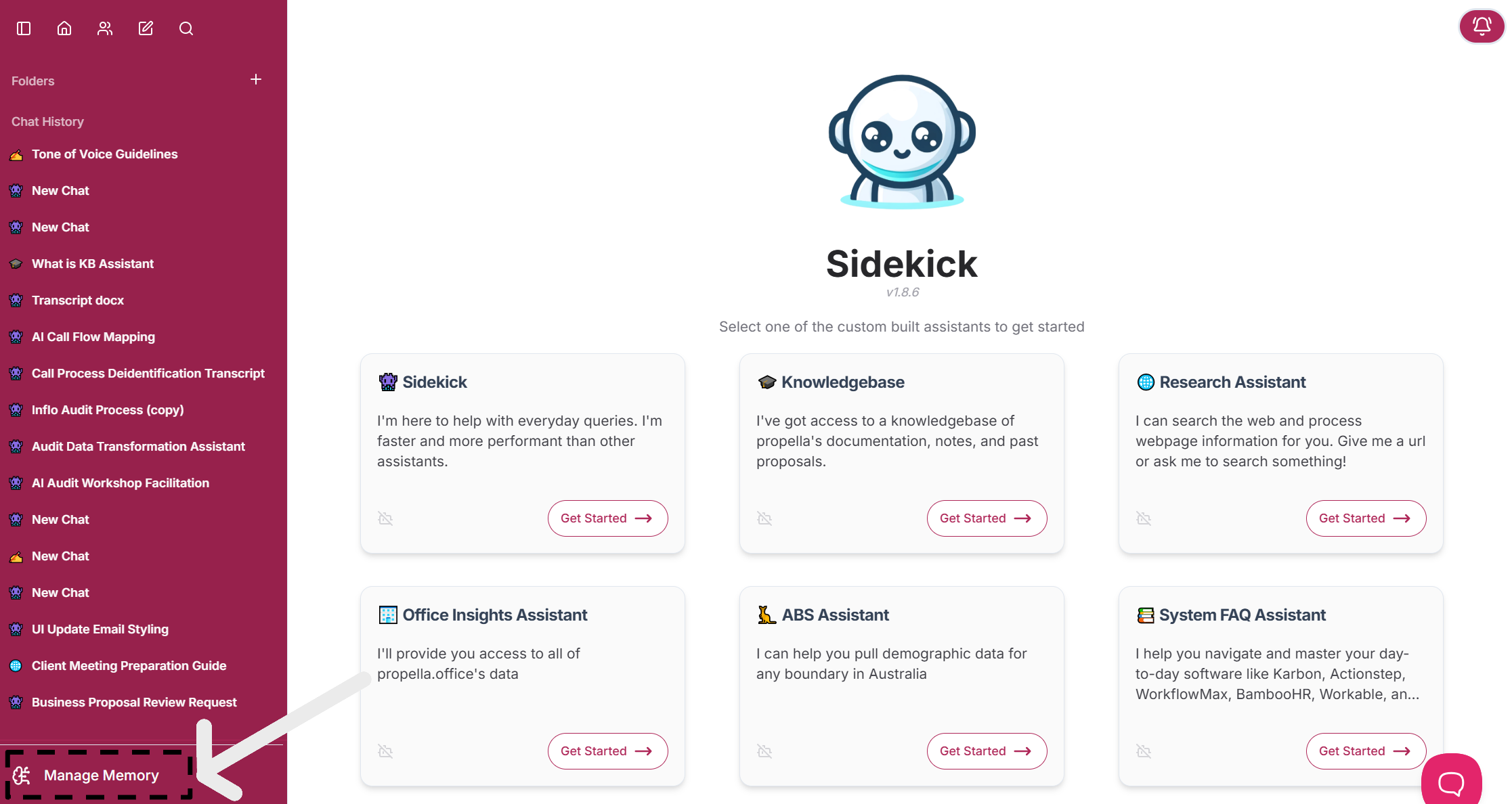 - Home Page – This is where you’ll see and use different assistants. Each assistant has a short description and a “Get Started -->” button to help you begin.