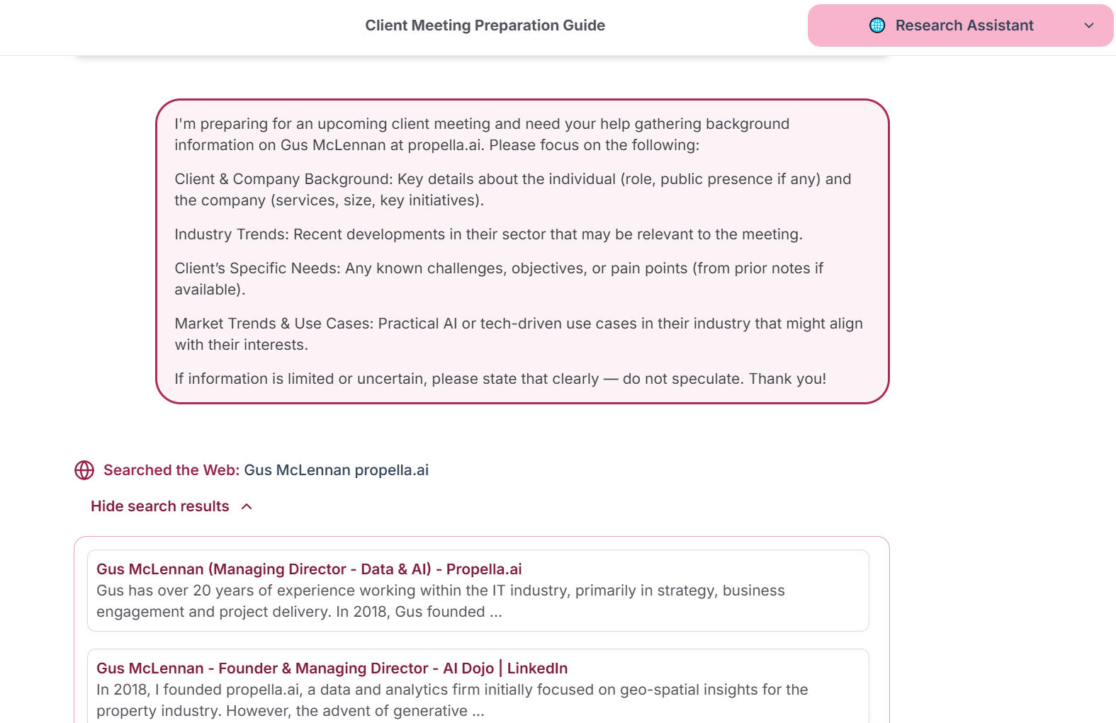 Want live info? Use the Everyday Assistant to search the web for your question. Great for research, finding reports, or exploring what’s happening in your industry. You can also review which results were returned in the search by selecting the Show search results link.