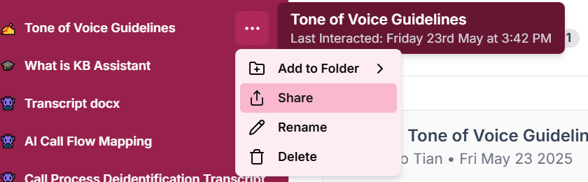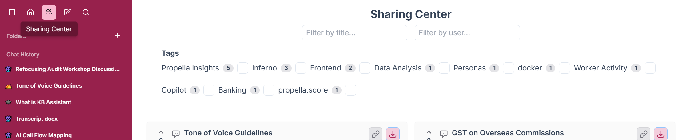 Use the Sharing Centre to send useful chats to colleagues. Add a title, tags, or share directly via a link