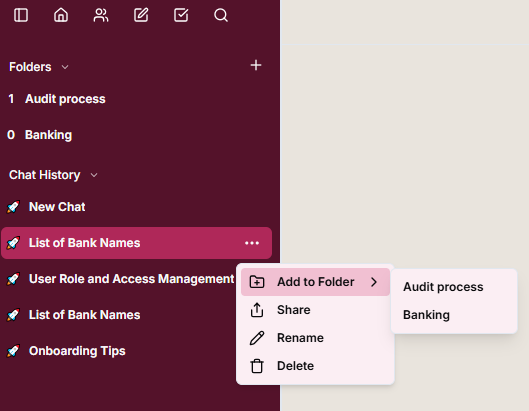 Create folders to organise your chats and enable quick access from the top of the navigation panel.
