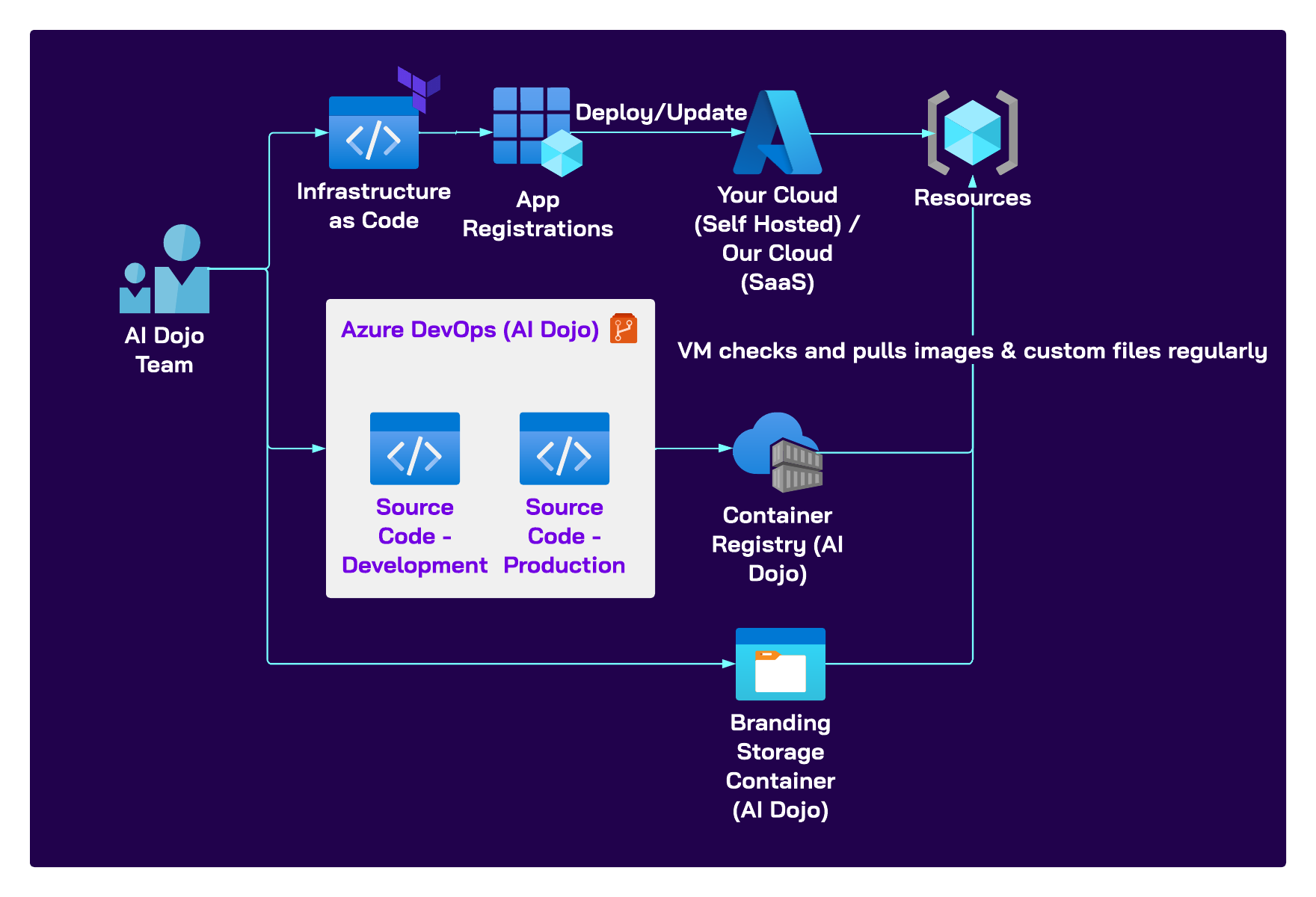 - Dev Platform and Dev Related Resources – used internally by AI Dojo for development, testing, and staging of changes before promotion to production.