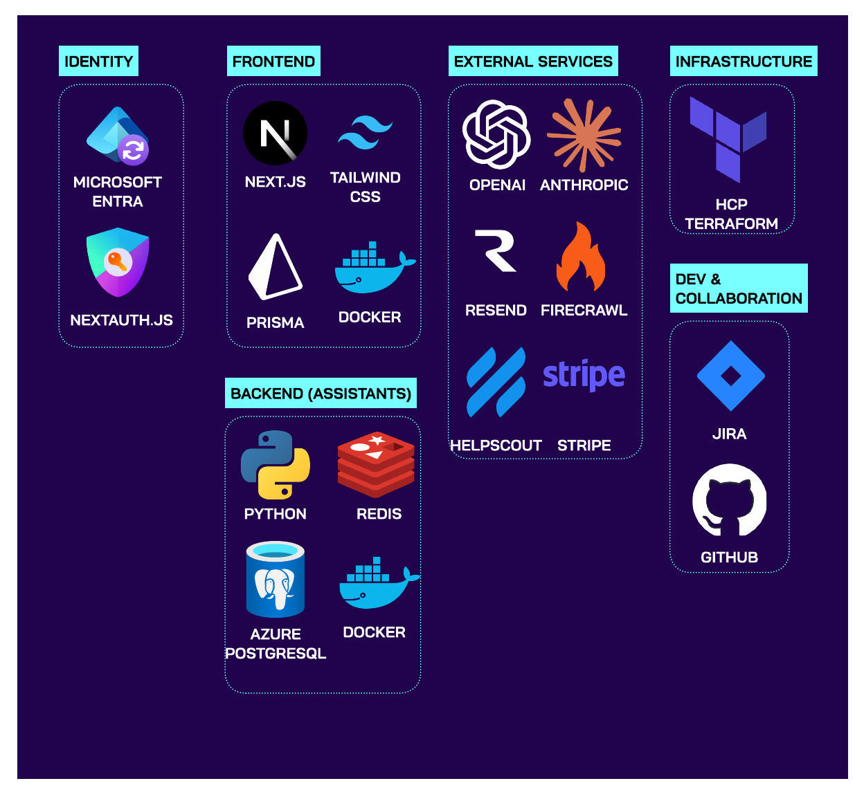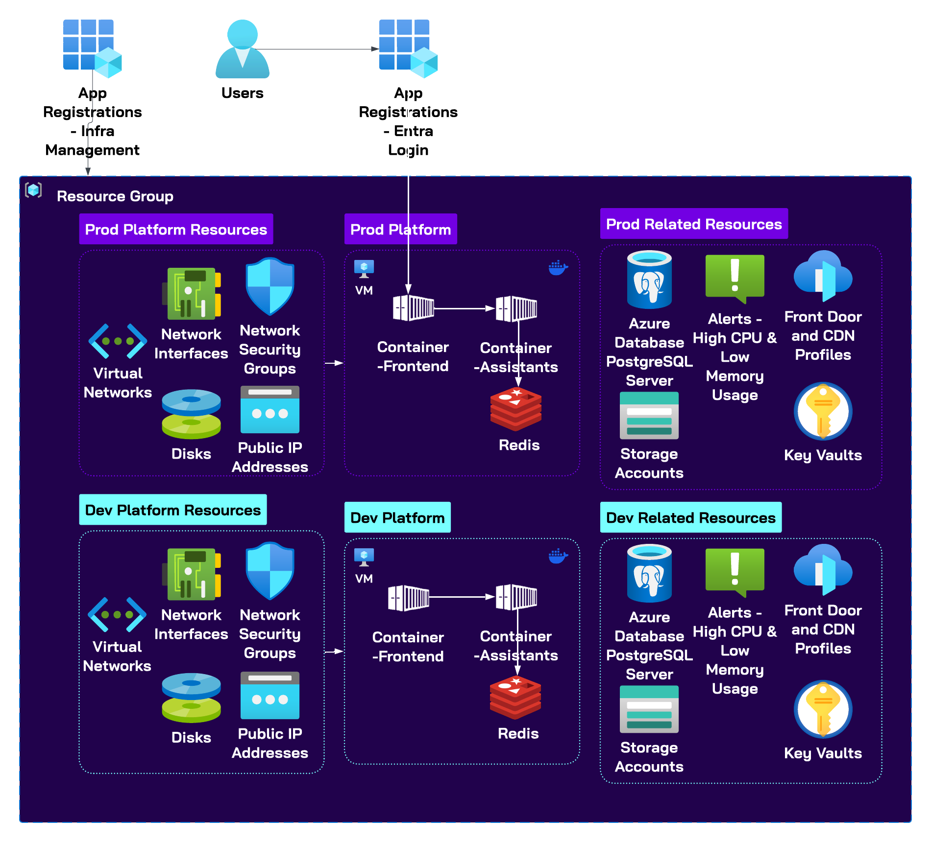 | Azure Linux Virtual Machines | Host the front-end and assistants (backend) services, each running as Docker containers in both production and development environments. |